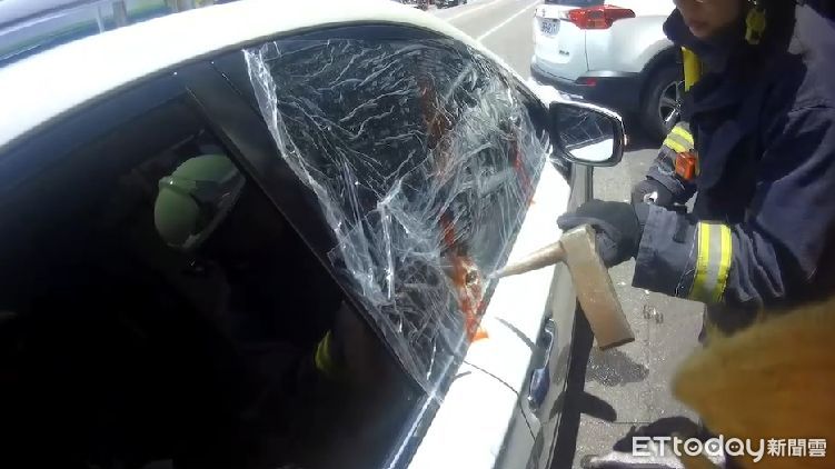 ▲消防員在副駕駛車窗周圍貼上膠帶,利用破壞器材擊破車窗,協助小朋友脫困。(圖/記者蔡文淵翻攝)