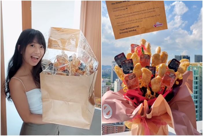 新加坡一對情侶約會時經常到連鎖速食店用餐,隨著兩人準備結婚,他們突發奇想把喜帖寄給麥當勞。沒想到麥當勞真的回覆,送上「雞塊花束」給予這對新人祝福。