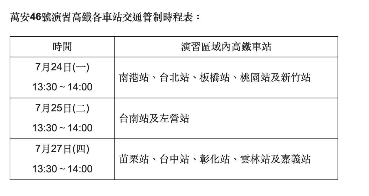 萬安46號演習將在下周一(7/24)、二(7/25)、四(7/27)分別於北、中、南地區舉辦,台灣高鐵公司配合交通管制措施,演習區域內之相關車站,將同步配合實施站內交通管制,時間自當日13時30分至14時00分,建議旅客於演習開始前提早到站。