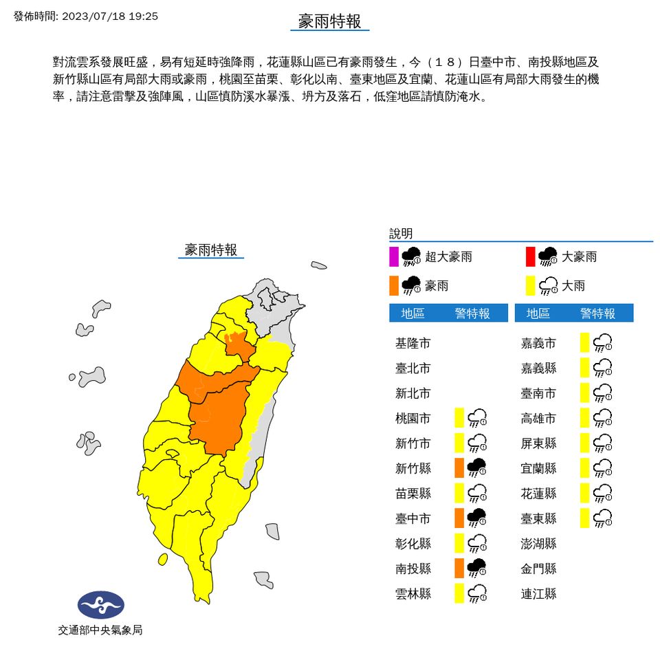 中央氣象局針對16縣市發布豪大雨特報,因對流雲系發展旺盛,易有短延時強降雨,花蓮縣山區已有豪雨發生,今(18)日台中市、南投縣地區及新竹縣山區有局部大雨或豪雨,桃園至苗栗、彰化以南、台東地區及宜蘭、花蓮山區有局部大雨發生的機率,請注意雷擊及強陣風,山區慎防溪水暴漲、坍方及落石,低窪地區請慎防淹水。