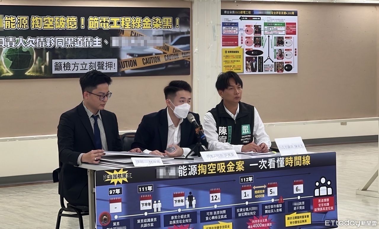 台北市一家創投公司董事日前透過朋友認識台中一家節能公司負責人,對方表示公司周轉不靈,於是陸續借他750萬元,沒想到得知負責人疑積欠黑道高利貸,竟掏空公司資產約4000多萬元來償還高利貸,董事發現後要求償還750萬卻遭設局恐嚇、毆打。今(21日)台北市議員陳宥丞召開記者會揭發節能公司吸金掏空陰謀,並痛訴黑道猖獗。
