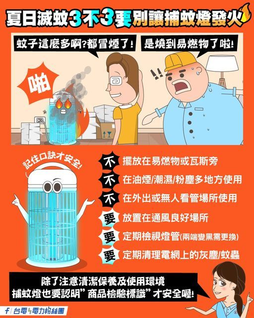 台電指出,大家在使用時一定要特別注意,千萬別讓捕蚊燈發火或發爐,一定要注意用電安全,夏日滅蚊,捕蚊燈3不4要包括: