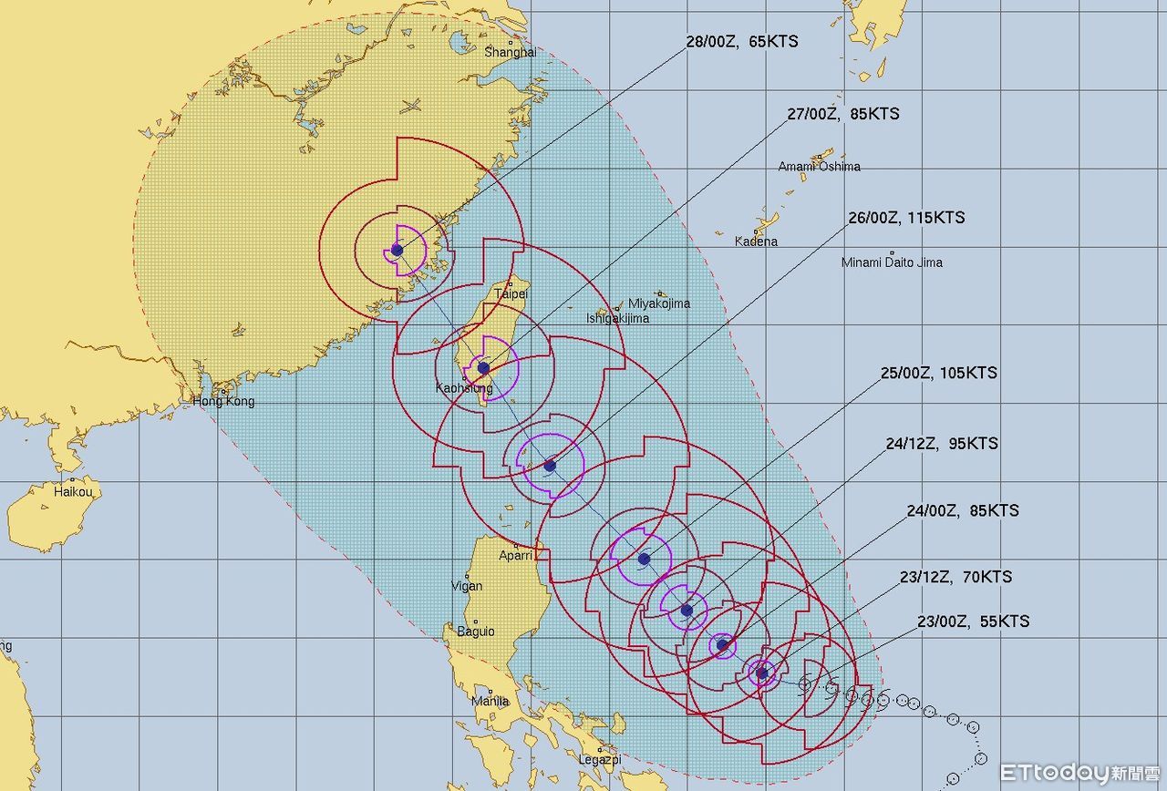 輕度颱風杜蘇芮位鵝鑾鼻東南方1130公里海面上,預計今晚(23日)轉中颱,周二(25日)朝台灣東南部前進,氣象粉專也公布美軍模式最新預測,杜蘇芮將從東南部登陸,不但穿越台灣且走法由南往北,可能閃過「護國神山」中央山脈,指出「是最不友善走法」,沒有跟中央山脈直球對決。