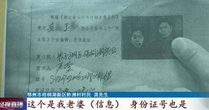 事後,龔先生趕緊來到鄂州市梧桐湖新區管委會徵地拆遷辦公室查看詳細資料。經過查詢,他發現拆遷領房資料中,自己的妻子和孩子變成了同村鄰居龔某的妻子和孩子。同時,妻子還跟這位龔某辦理了一個「二胎生育證」。龔先生解釋,「這個是我老婆,身份證號也是,但是照片不是本人的。」