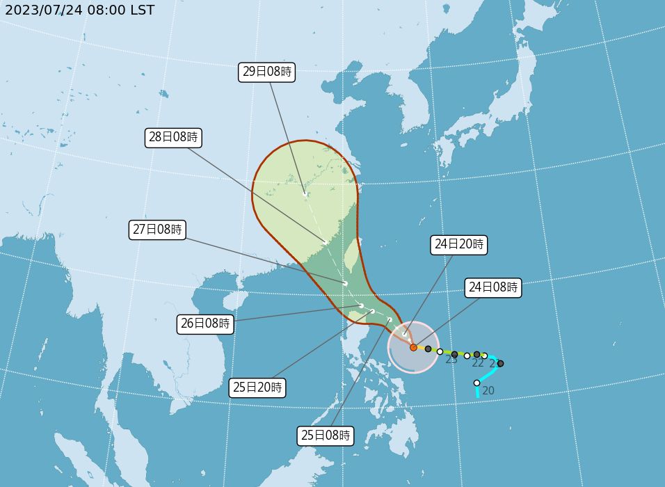 氣象局官網資料指出,今日8時杜蘇芮的中心位置在北緯 15.2 度,東經 126.5 度,以每小時15公里速度,向北北西進行。中心氣壓965百帕,近中心最大風速每秒35公尺,瞬間最大陣風每秒 45 公尺,七級風平均暴風半徑 250 公里,十級風平均暴風半徑 80 公里。