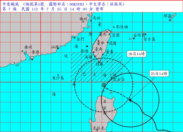 杜蘇芮今(25日)下午2時的中心位置在北緯18.2度,東經123.8度,即在鵝鑾鼻的東南方約510公里之海面上,以每小時13公里速度,向西北西進行,近中心最大風速每秒48公尺(約每小時173公里),相當於15級風,瞬間最大陣風每秒58公尺(約每小時209公里),相當於17級風,七級風平均暴風半徑300公里。