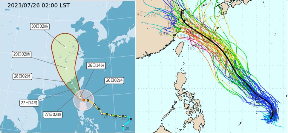 ▲左圖:26日2時中央氣象局「路徑潛勢預測圖」顯示,「杜蘇芮」未來通過巴士海峽、台灣海峽南部、進入大陸。右圖:「杜蘇芮」東南方海面熱帶擾動,最快明天發展成第6號颱風「卡努」。(圖/翻攝三立準氣象.老大洩天機)