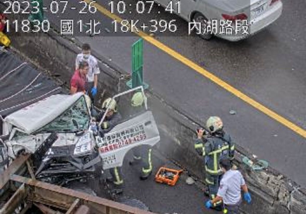 ▲國道一號北上18公里處,一輛貨車與貨櫃車發生碰撞,貨車駕駛受困車內。(圖/翻攝國道監視器,下同)