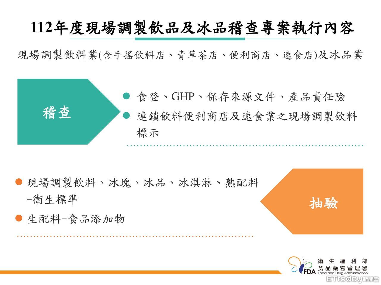 「2023年度現場調製飲品及冰品稽查專案」係針對手搖飲料店、青草茶業者、連鎖便利商店、連鎖速食業者等現場調製飲料業者及現場調製冰品業者查核食品業者登錄、食品良好衛生規範(GHP)準則、連鎖飲料便利商店及速食業之現場調製飲料標示、保存來源文件及抽驗,確認是否符合食品安全衛生管理法相關規定。