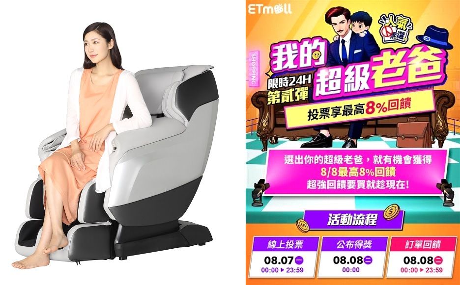 ▲東森購物網推出「超級犒爸節」,全站滿額抽仿太空艙設計Bakkarat豪華按摩椅;8/1、8/7參加「我的超人老爸」投票活動,最高可獲得8%回饋。(圖/東森購物提供)