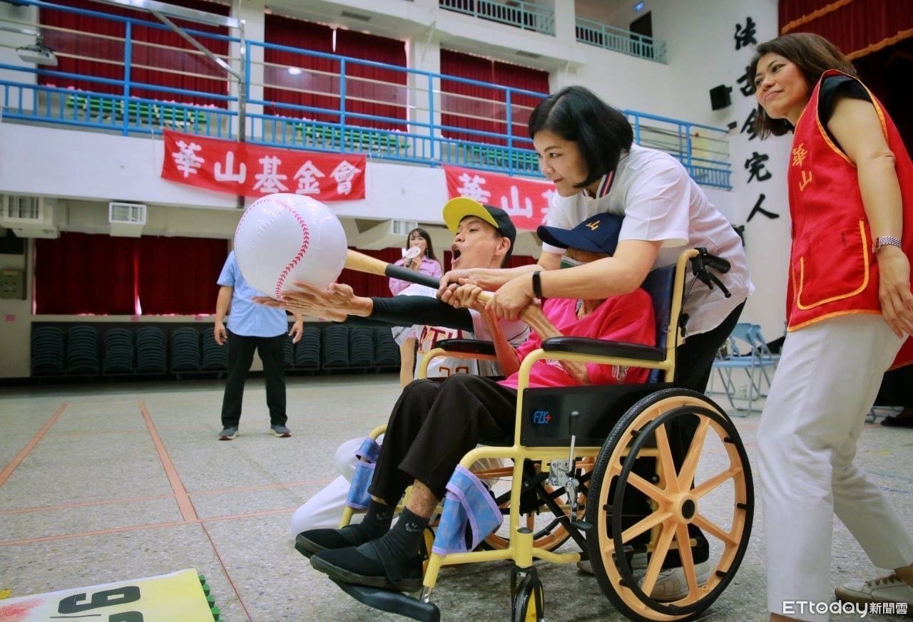 ▲暖身的開球儀式,由台灣閃亮之星藝人黃鐙輝開球,百歲人瑞施阿嬤乘坐輪椅擔任打擊,打擊後由張縣長協助推行輪椅跑壘。(圖/記者蔡佩旻翻攝)
