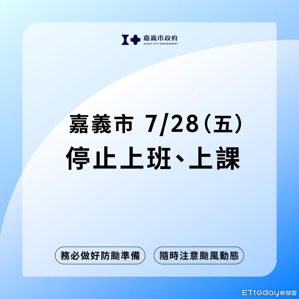 嘉義市長黃敏惠表示,依據中央氣象局颱風雨量風力預測,基於與嘉義縣為共同生活圈,且受地形、雨量等影響恐將影響通行及上班上課安全,為維護市民之安全及準備各項防災應變作為 ,嘉義市宣布今(7/28)日停止上班、停止上課,籲請民眾多加留意最新颱風訊息,注意自身安全,確實做好防汛應變措施。