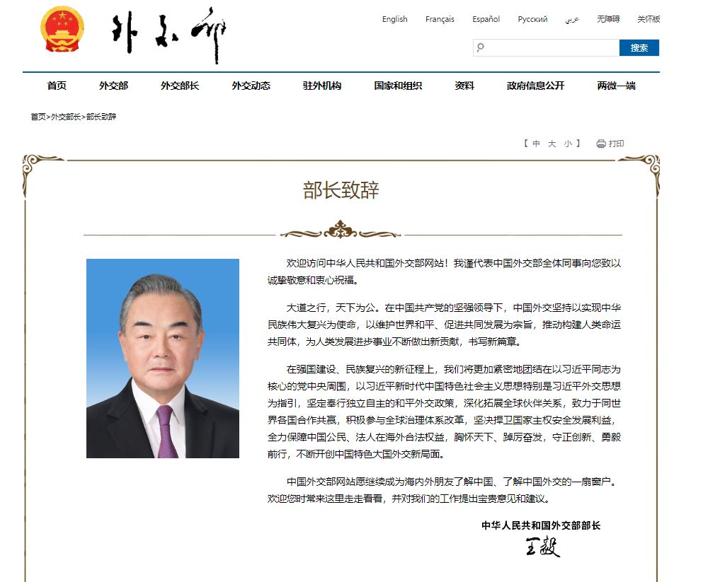 另外,官網同時更新「部長致辭」,王毅在致辭中說,大道之行,天下為公。在中國共產黨的堅強領導下,中國外交堅持以實現中華民族偉大復興為使命,以維護世界和平、促進共同發展為宗旨,推動構建人類命運共同體,為人類發展進步事業不斷做出新貢獻,書寫新篇章。