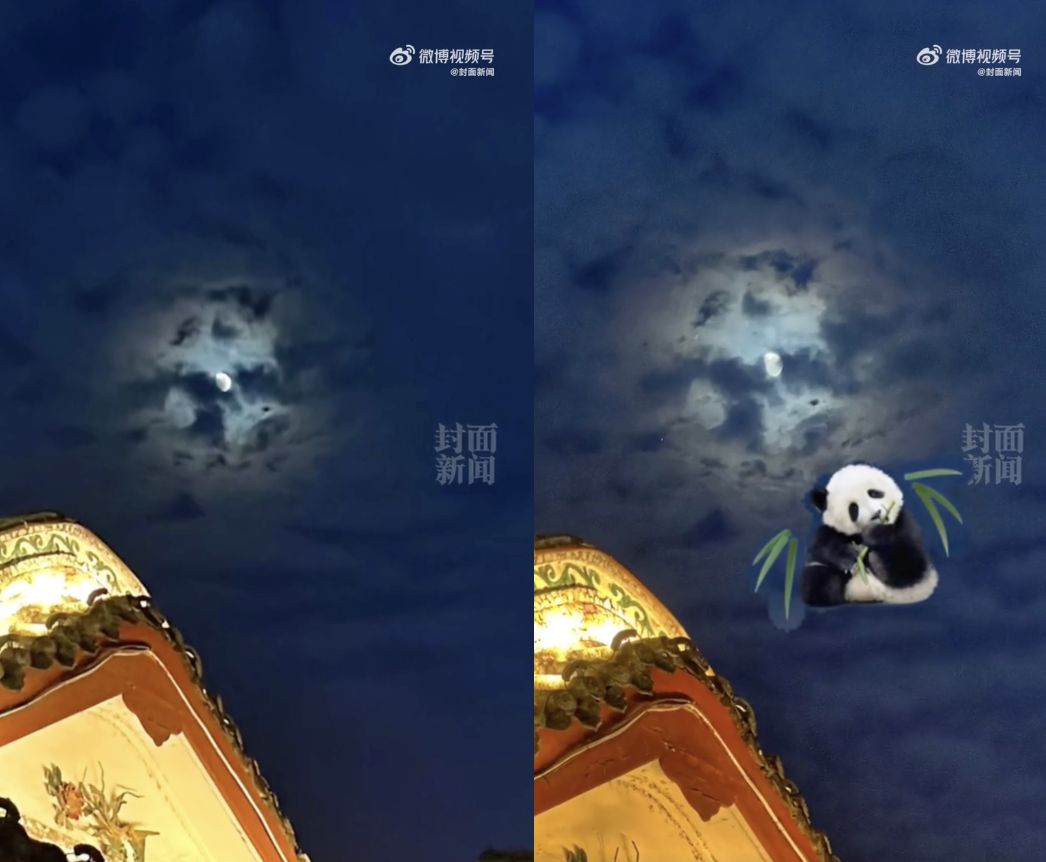 就有網友在世大運開幕式當晚,看到「熊貓雲」,將影片上傳到社交平台。從影片中看到在月光的映襯下,夜空中薄薄的雲層好似一隻大熊貓,懷中還抱著月亮。