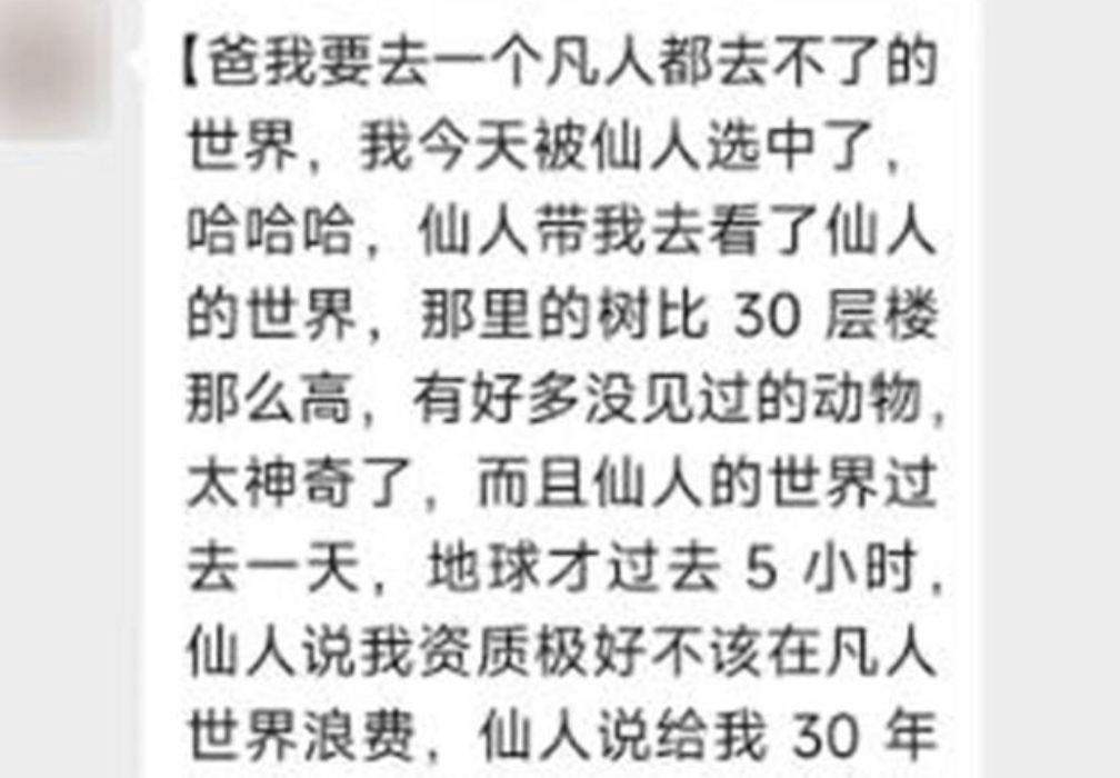 凌晨2時許,王先生兒子發出一條詭異的訊息給父親,「爸,我今天被仙人選中了,我要去一個凡人都去不了的世界,仙人說給我30年時間,我可以回來,如果30年後,我沒有回來,那就證明我死在仙人的世界了,再見了,勿尋勿念!」