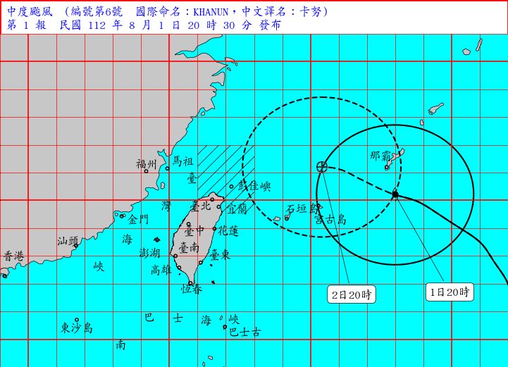 今年第6號中度颱風「卡努」(Khanun)走向詭譎成謎,並將在2天後從台灣北邊大轉彎,大台北地區遭暴風侵襲機率60%以上,基隆高達70%,受颱風外圍雲系影響,今天(1日)北台灣已經開始出現雨勢。中央氣象局預報,颱風將於3、4日(周四、五)最接近,暴風圈距離東北角陸地非常靠近,若路徑再往西偏或暴風半徑擴大,也有機會發布陸上警報,今晚8時30分已經先行針對台灣北部海面、東北部海域發布「海上颱風警報」。