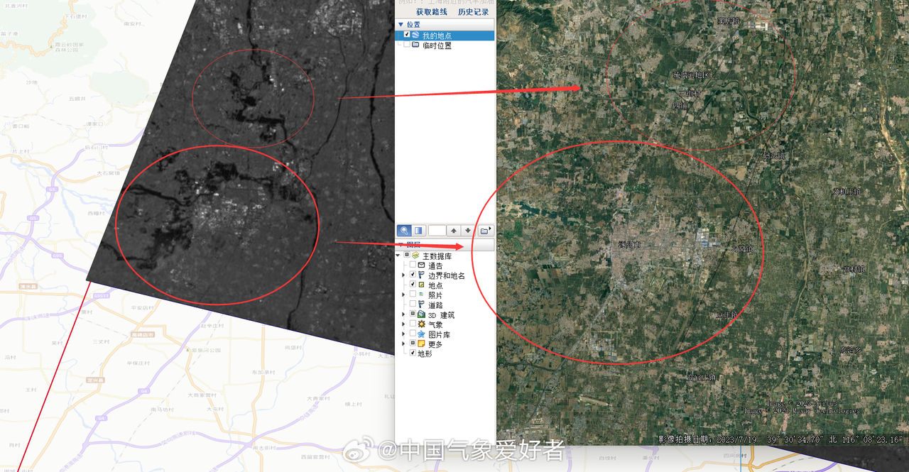大陸京津冀地區(北京市、天津市、河北省)從7月29日起受「杜蘇芮」颱風影響,持續受到暴雨襲擊,其中河北涿州市災情較為嚴重,衛星影像顯示,目前正在被洪水「3面包圍」,河流附近區域幾乎完全泡在水裡,農田被淹沒,道路也被迫中斷,預估新增水體面積超過20平方公里。