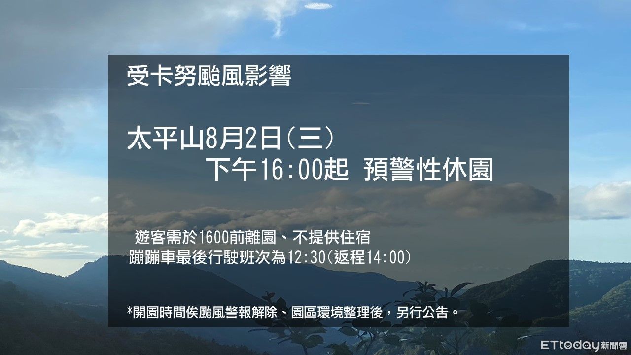 中颱「卡努」持續接近台灣,中央氣象局預計今天17:30發布陸上颱風警報,北台灣風雨越晚越明顯,明日雨勢更加劇。農業部林業署所轄太平山森林遊樂區從今天下午4時起預警性休園,新竹和台中分署轄管多處森林遊樂區與自然步道,明天也暫停開放。林業署呼籲民眾颱風影響期間,避免從事山域活動。