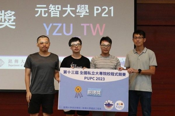 隨著科技日新月異,程式設計不僅是未來市場趨勢,更是核心競爭力,與產業發展密不可分。元智大學資工系學生在王任瓚、簡廷因、林佑政、徐逸懷教授指導,參加第13屆全國私立大專院校程式競賽,在全國多所私立大學參賽隊伍脫穎而出,共奪1金2銀2銅的好成績。