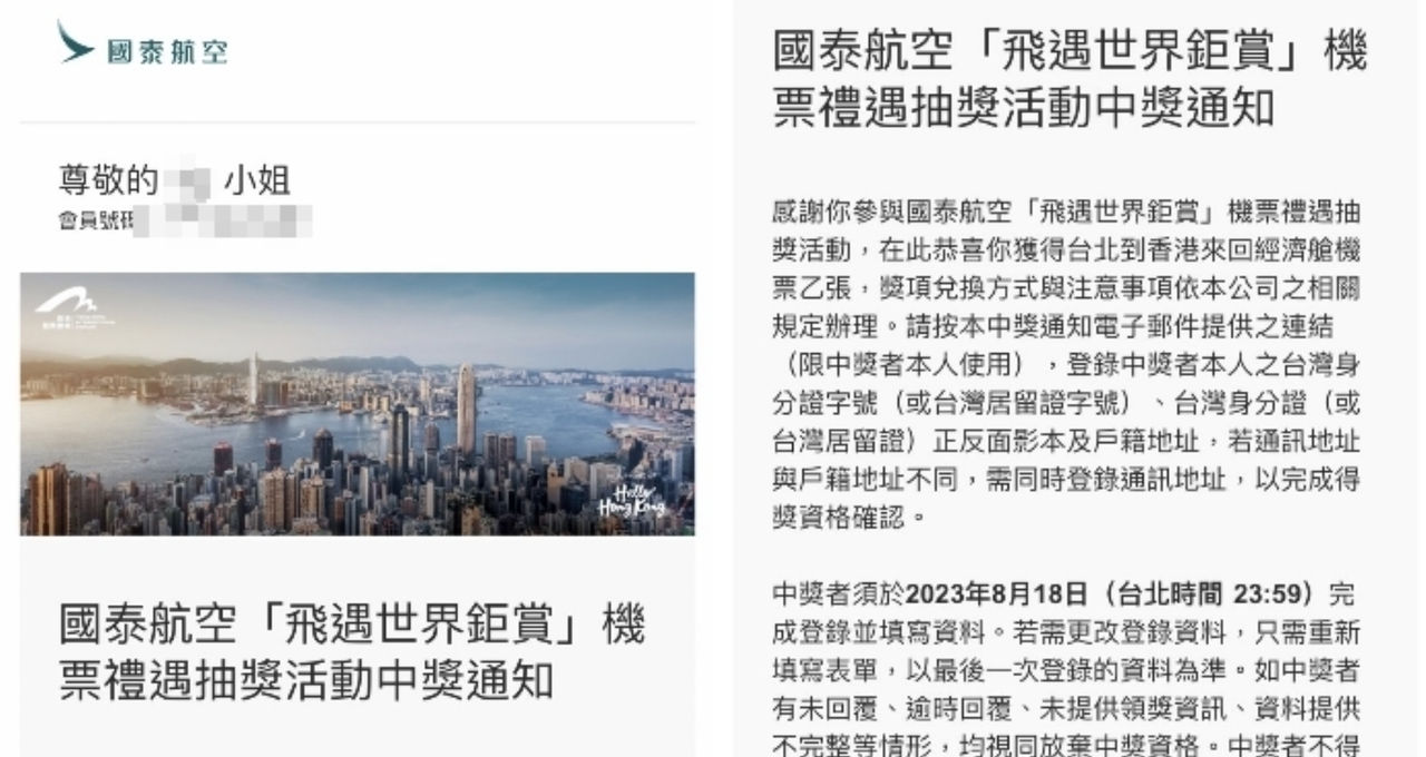 就有讀者今天向《ETtoday新聞雲》透露,她在上午11點27分收到國泰航空的中獎通知電子郵件,令她欣喜萬分。信上內容可見,「感謝你參與國泰航空「飛遇世界賞」機票禮遇抽獎活動,在此恭喜你獲得台北到香港來回經濟艙機票乙張」。