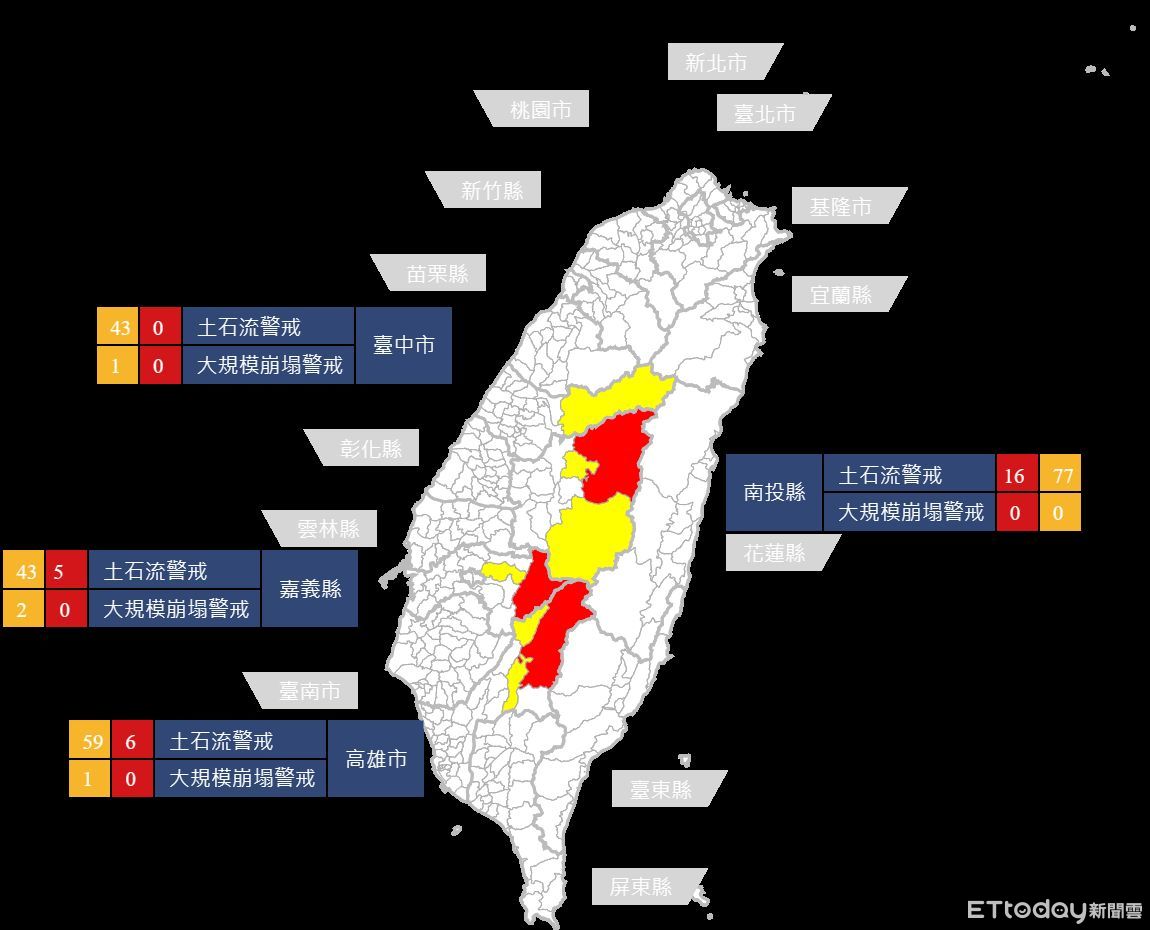 農村水保署也發布土石流黃色警戒共222條,分布在南投縣仁愛鄉、信義鄉、埔里鎮;高雄市六龜區、那瑪夏區、桃源區;嘉義縣竹崎鄉、阿里山鄉與台中市和平區。