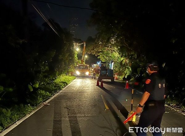 龍潭分局高平派出所、聖亭派出所今日凌晨到白天分別接到通報有路樹傾倒於車道上,導致雙向無法通行,兩所員警到場後皆先將警車警示燈開啟,提醒用路人避免過往人車發生事故,隨即下車於現場擺放交通錐並進行交通疏導,通知相關單位前來處理。