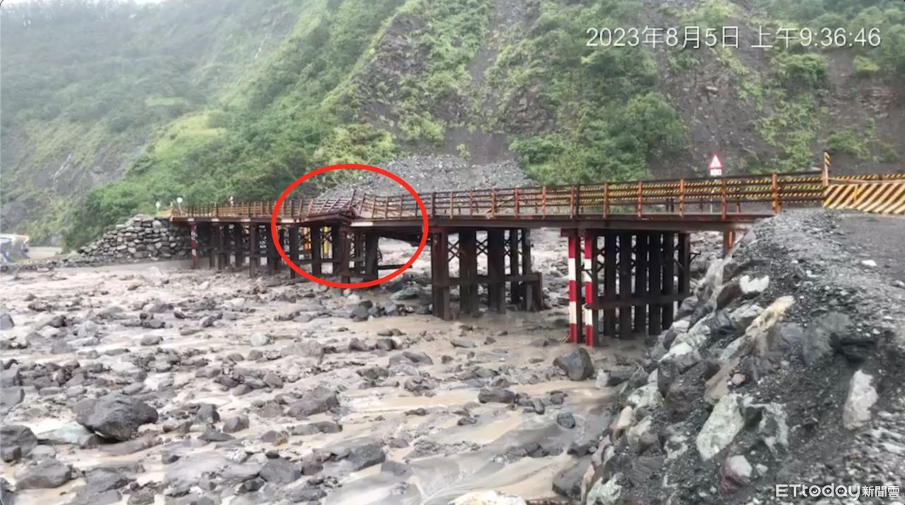 ▲明霸克露便橋的橋面受損嚴重,底下的柱因為土石流被撞毀歪斜 。(圖/記者吳奕靖翻攝)