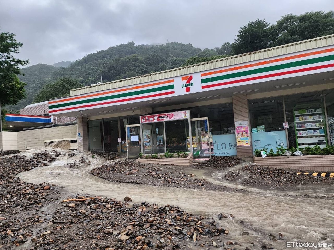 在加油站旁的超商同樣內部也因淹滿泥水,完全無法營業,門前則是出現滾滾泥流不斷沖刷,宛如一條小溪,也無法進入超商內部,至於何時能清理完畢復業,仍不得而知。
