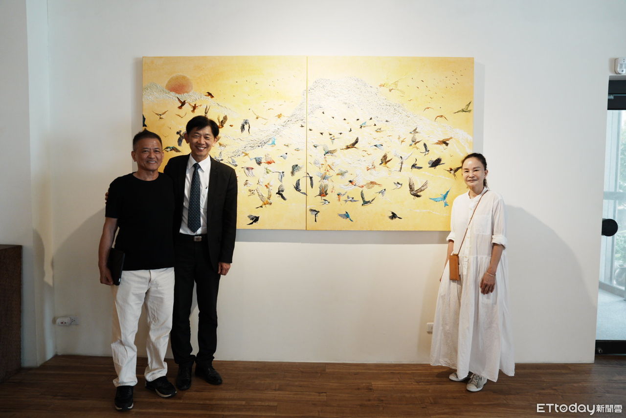 ▲藝術家陳俐維在台南甘樂阿舍美術館舉辦「樂在砌中」個展,台南市副市長葉澤山(左2)、、甘樂阿舍美術館創立者藝術家曾英棟(左1)都到場欣賞畫作。(圖/記者林東良翻攝,下同)