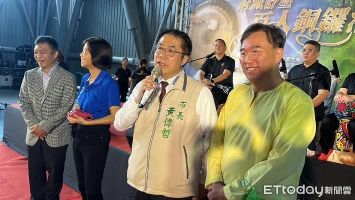 台南市長黃偉哲受邀參與「府城紓壓百人銅鑼浴」活動,他感謝從馬來西亞遠道而來的銅鑼大師Jeff率領10多位銅鑼師,帶領台南民眾透過銅鑼音波的洗滌,感受身心靈療癒的體驗,同時也感謝市議員王家貞一直以來努力推動民眾身心靈健康的議題。