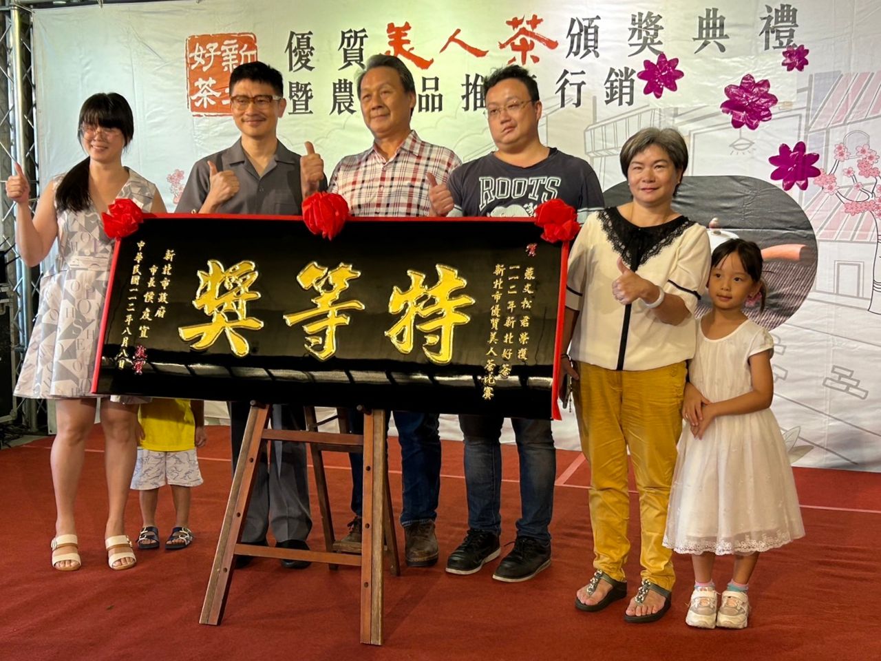 新北市石碇區農會今(8日)辦理「新北市美人茶評鑑比賽」頒獎典禮,新北市政府農業局長李玟出席頒獎,肯定農友努力,本次為坪林區蘇文松拿下特等獎,蘇文松與兒子共同創立「山香研茶」品牌,今天也是父親節,蘇文松笑著表示,能夠獲得特等獎,是最好的父親節禮物。
