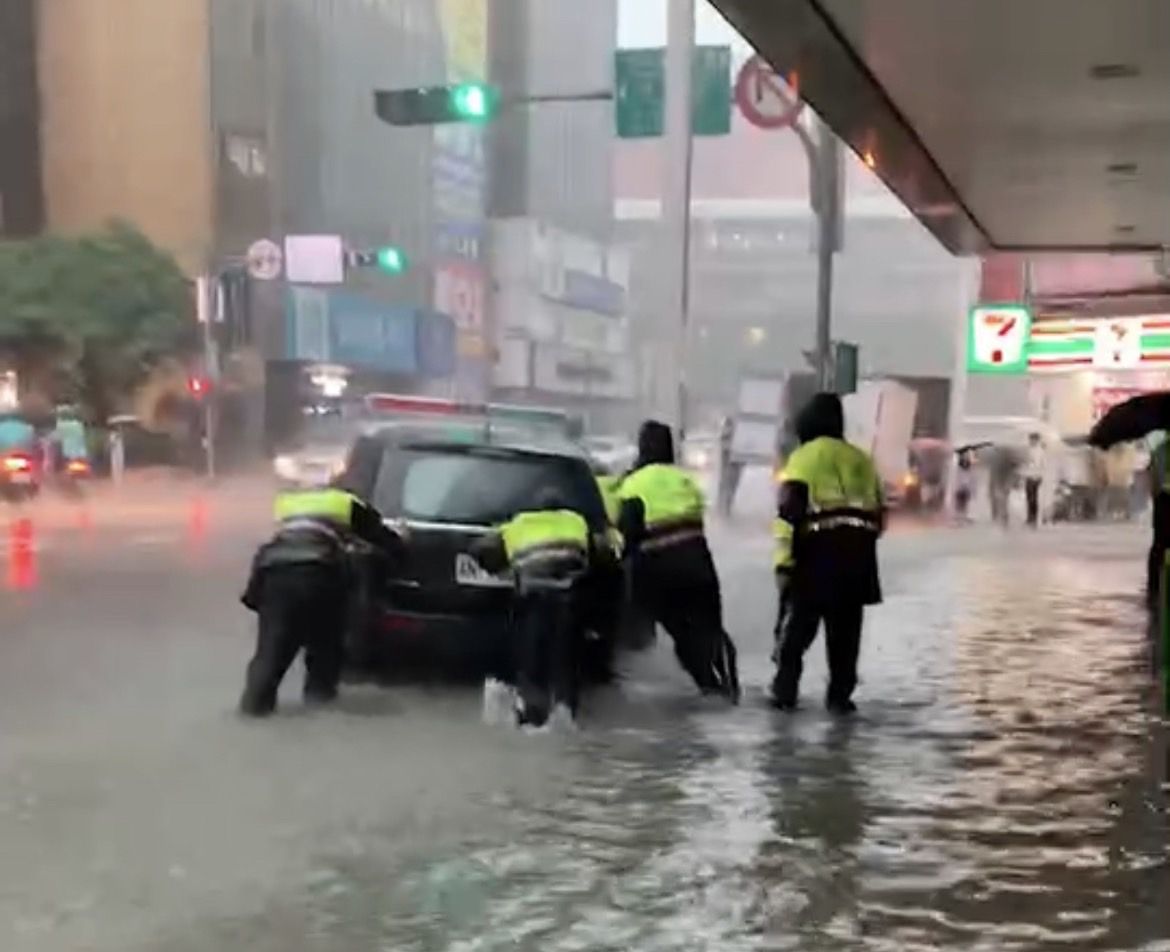 忠孝西路派出所警員見狀,也立刻衝出去將警車推到沒有淹水的高處,再行啟動駕駛離去,停放在安全處所,避免警車排氣管進水,釀成警車引擎損傷。