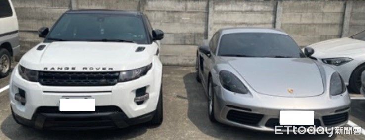 ▲檢警查扣詐團首腦蔡女及幹部陳女名下的保時捷與Land Rover。(圖/記者白珈陽翻攝)