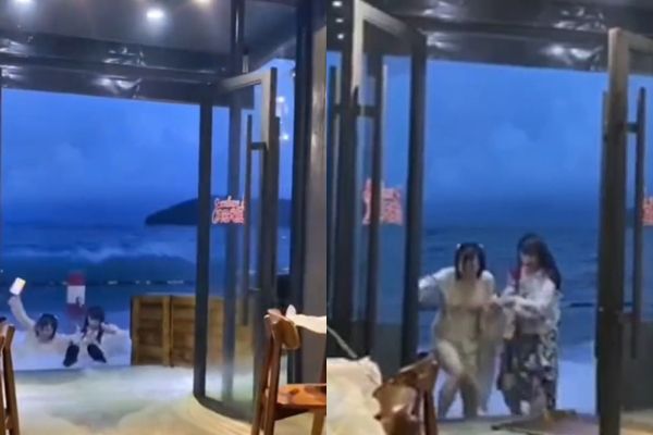 在海景餐廳用餐十分浪漫,是不少情侶、家庭旅遊時的首選。不過,廣西北海潿洲島近日發生一起離奇事件,一陣大浪將某間海景餐廳的大門給拍開,隨後又有2名女子被捲到餐廳門口,2人狼狽的模樣在網路上曝光,瞬間引發討論。