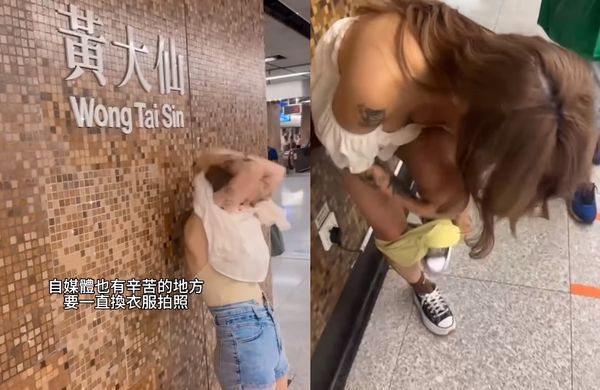莉娜的好友5日在IG分享一段影片,只見莉娜當時在人來人往的黃大仙地鐵站,先是套上低胸平口白色上衣,再將原本穿著的貼身背心脫下,整過換衣過程都被一旁的同行友人拍下。影片中還標註文字「自媒體也有辛苦的地方,要一直換衣服拍照,但是你要多懶?這真的是有經驗才有辦法這麼順利欸」。