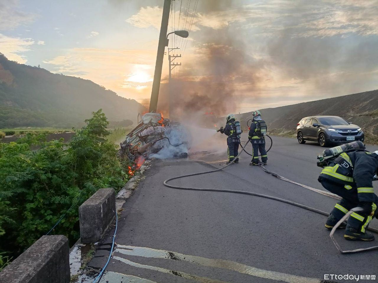 台中市外埔區鐵山橋今(13)日17時45分傳出一起嚴重車禍,警消到場後,發現一輛轎車全面燃燒,車上有人未脫困,遭大火燒成焦屍,沒辦法辨識性別,詳細原因仍待警消調查釐清。
