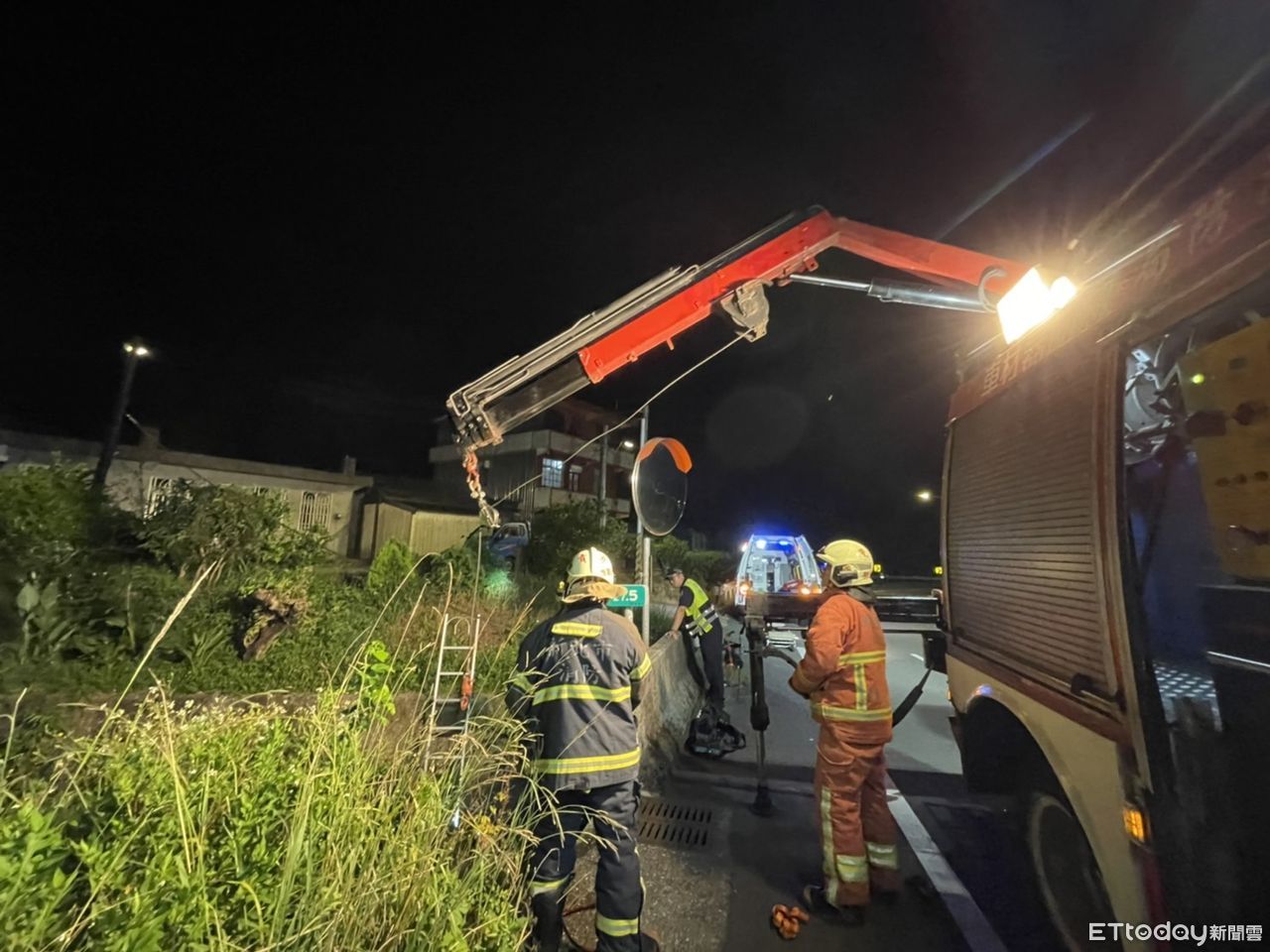 新北市消防局指出,昨晚間22時55分接獲民眾報案,稱有機車騎士摔落3公尺深水溝,消防人員獲報後到場,現場為17歲機車騎士跌落水溝,隨即給予頸圈及長背板固定,並將男騎士吊掛救出。