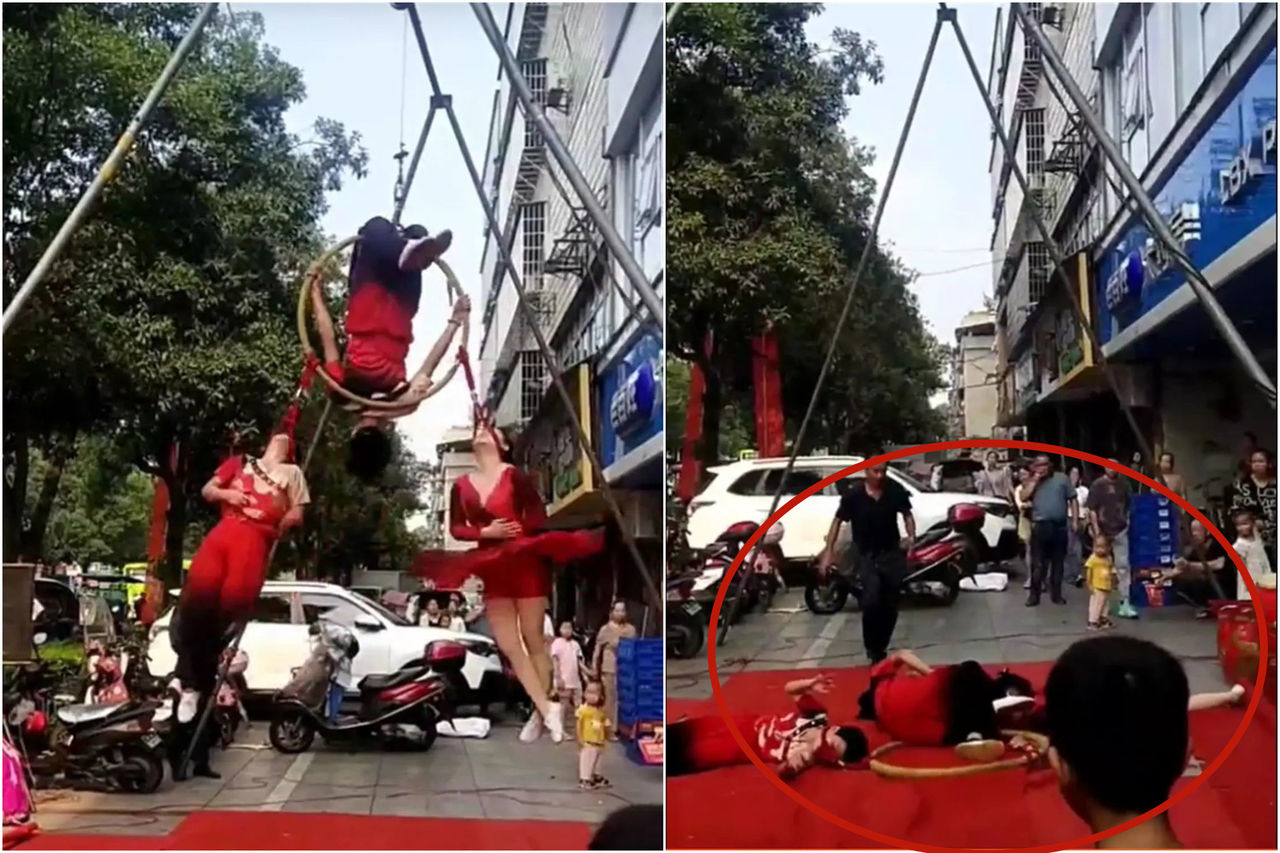 大陸社交軟體近日瘋傳一段高空特技表演失敗的影片,驚悚畫面震撼網友。8月12日上午,湖南婁底漣源市福源路一家超市門口,3名演員在表演高空特技時,升到最高點時,突然從空中墜落至地面,後被送至醫院救治,許多人在現場直擊嚇歪。