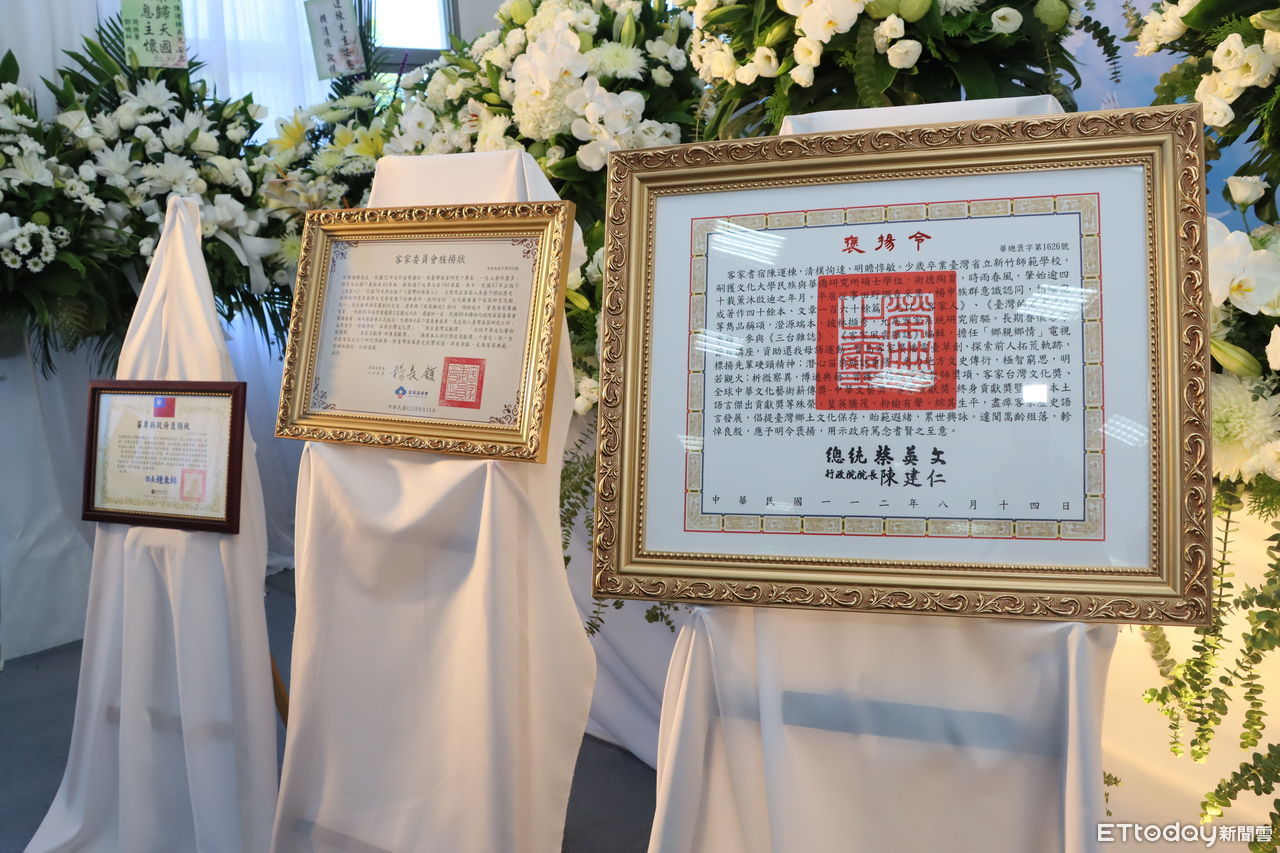 ▲陳運棟畢生奉獻客家,總統頒發褒揚令,客委會頒發旌揚狀,苗栗縣長頒發褒揚狀。(圖/苗栗縣政府提供)