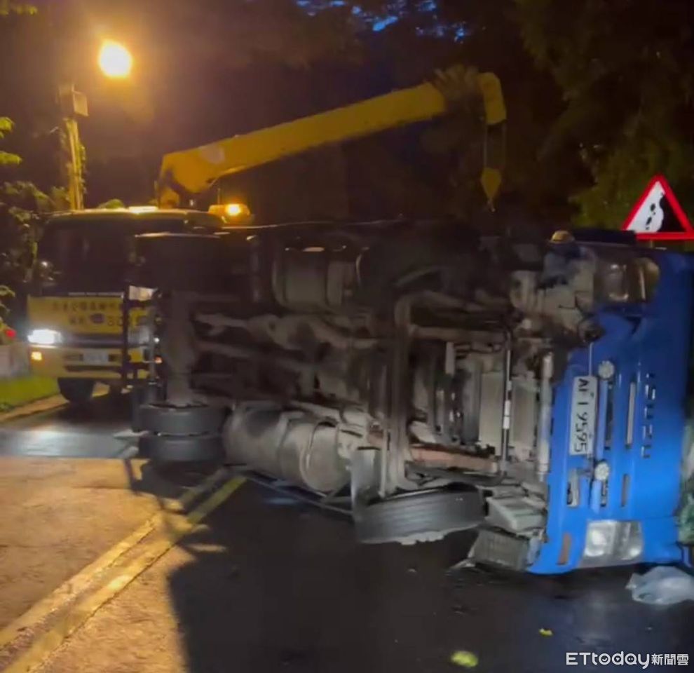 ▲▼載運水果的3.5噸貨車不慎壓到路面油漬翻覆,員警獲報前往處理管制交通,並連繫吊車來拖吊。(圖/記者哈勇嘎奧翻攝,下同)