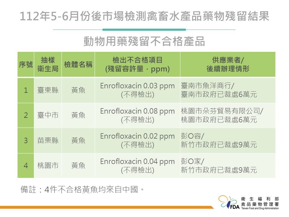 食藥署說明,此次4件不合格產品都是自中國進口的「黃魚」,分別於家樂福台東分公司、珍饌全冷凍牛排海鮮連鎖專賣店、家樂福苗栗分公司、大潤發流通事業股份有限公司平鎮分公司所抽驗到。