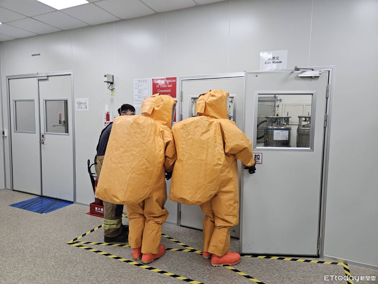▲警消穿「A級防護衣」入內檢查閥體。(圖/記者林東良翻攝,下同)