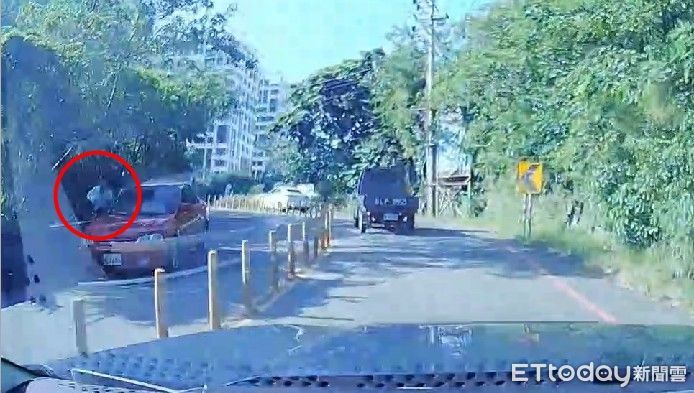 ▲行車紀錄器清楚拍下紅色小客車將路人撞下溪溝的一幕。(圖/記者陳凱力翻攝,下同)