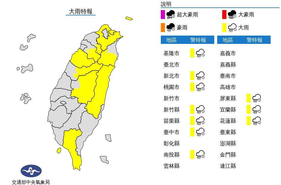 *大雨:基隆北海岸、新北市、桃園市山區、新竹縣山區、苗栗縣、臺中市山區、南投縣山區、屏東縣、恆春半島、宜蘭縣山區、花蓮縣