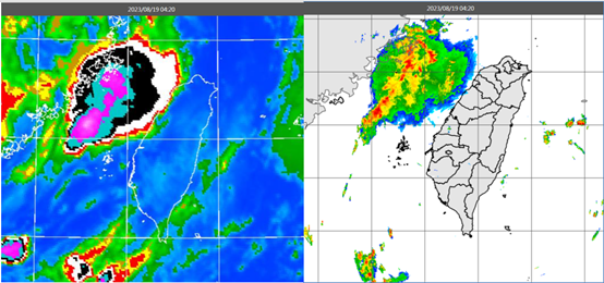 ▲左圖:今(19日)晨4:20紅外線色調強化雲圖顯示,台灣海峽北部對流雲系接近中。右圖:19日4:20雷達回波合成圖顯示,對流雲系伴隨線狀回波。(圖/三立準氣象.老大洩天機)