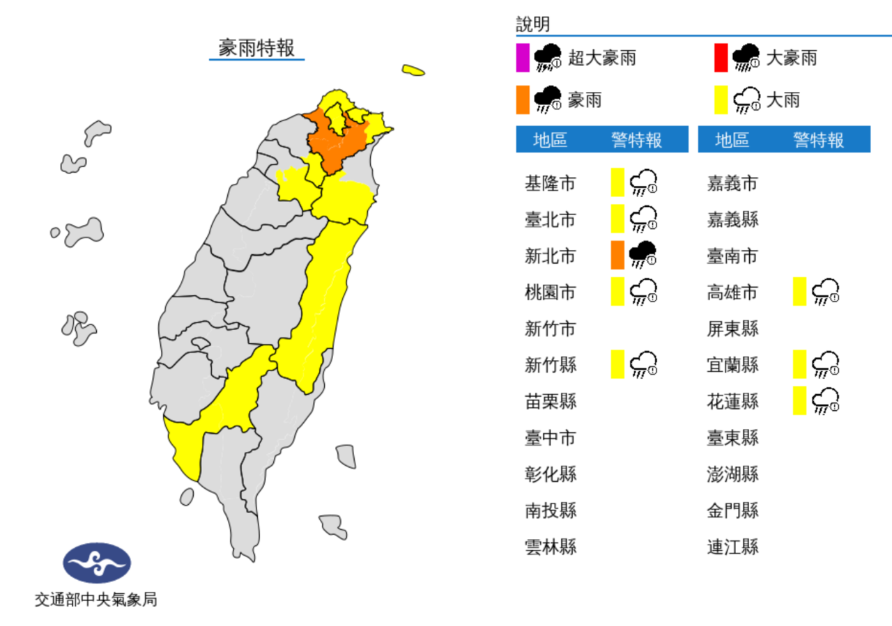大雨:基隆北海岸、台北市、桃園市山區、新竹縣山區、高雄市、宜蘭縣山區、花蓮縣