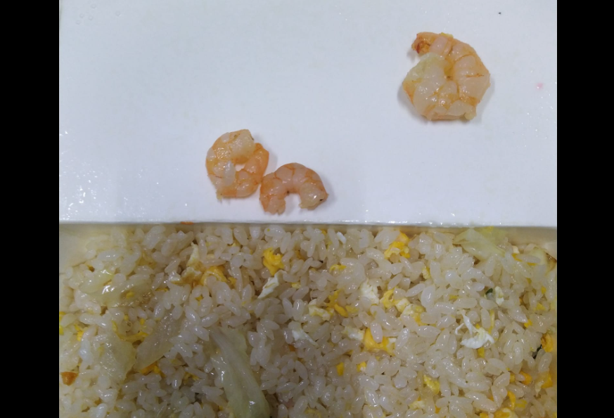網友日前在爆料公社發文指出,當晚8點多,家裡孩子指定吃蝦仁炒飯,由於老家住高師大附近,離光華夜市比較近,加上熟悉的店公休,於是隨便找了一家買飯,「回到家一打開餐盒,發現好像沒啥料,所以好奇把飯全挖開,結果就只發現3隻蝦仁。」