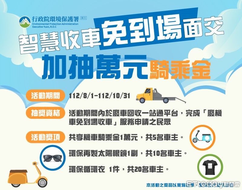為提升廢車回收的便利性,環保署從今年8月1日起試辦「廢機車智慧定位,車主免到場收車」服務,民眾只要利用「廢車回收一站通」平台,簡單操作3個步驟,即可完成申請服務,即日起至10月31日前申請使用,還有機會抽中萬元騎乘金。