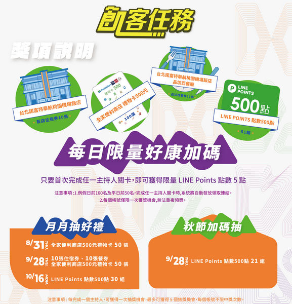 「飢客任務」原來是款大型實境遊戲,有不同關卡,民眾只要到世客博內的「飢餓遊戲總部」,掃描QR code加入飢客任務 LINE官方帳號,點選故事內容了解遊戲內容,跟隨故事情進入集點任務,跟著線索闖關、完成任務,不但能與內建主持人相框合照印製賀卡,還能獲得抽獎資格。活動獎品豐富,每週LINE Point點數、超商禮物卡限量放送、還有機會抽到台北諾富特華航機場飯店住宿券、品坊西餐廳餐券。