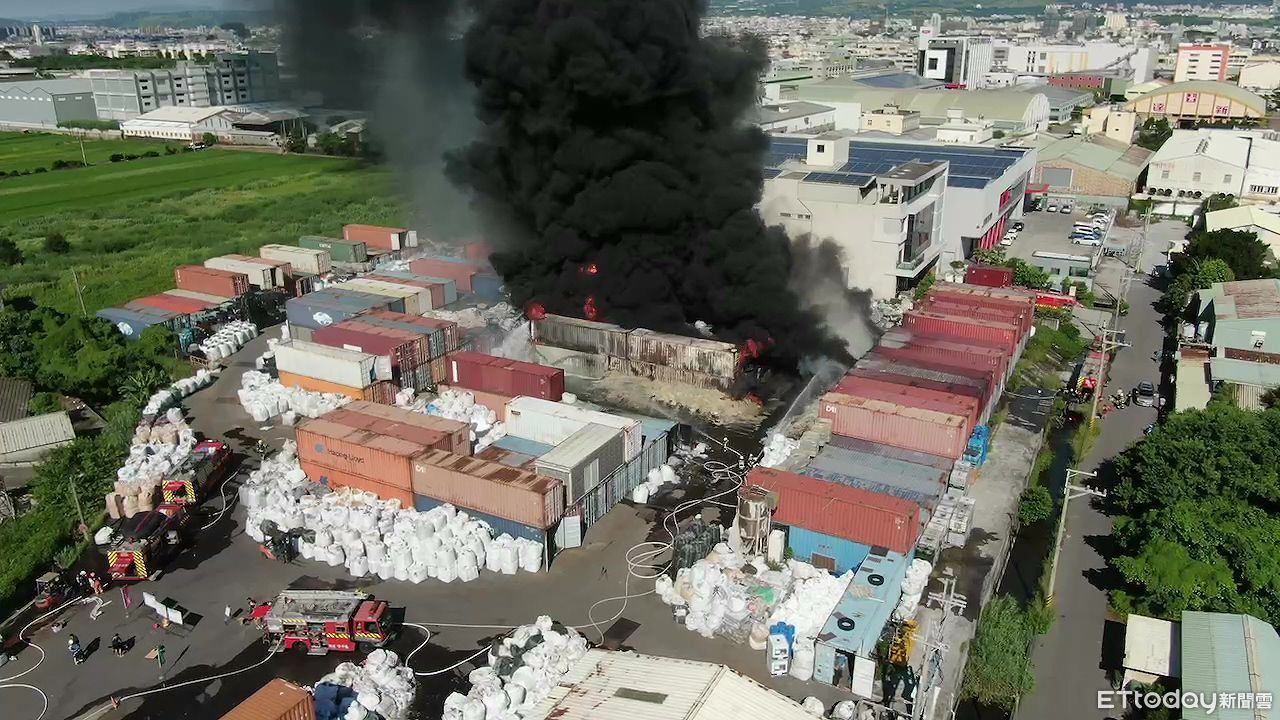 從空拍視角向下俯瞰,位在台中市梧棲區梧南路上一處資源回收廠,多個貨櫃擺放在一處廣場,中間疑似因堆放的塑膠顆粒起火,火勢一發不可收拾,加上全是易燃物,火勢延燒迅速,濃厚的黑煙直衝天際,也能聞到異味,所幸未往一旁廠房延燒,無人員傷亡。
